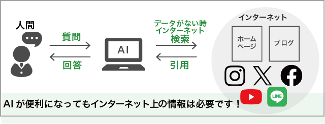 AIに質問しても、AIのデータベース内に情報がない場合は、インターネット上のホームページやブログ、SNS(Instagram・X・Facebookなど)の情報を検索し、引用して回答しています。