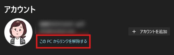 設定画面でメニューから「アカウント」を選び、「このPCからリンクを解除する」をクリック
